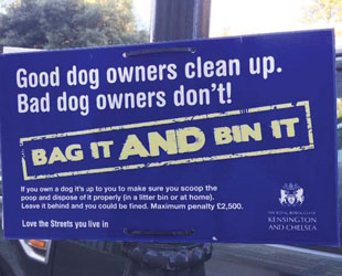 This photo shows how seriously London residents take cleanliness. If a dog fouls a sidewalk or street in Kensington or Chelsea, the owner could be fined 2,500 pounds sterling, or about 3,700 U.S. dollars. (There was another sign that said the top fine was 1,000 pounds, but I liked this one better.)
