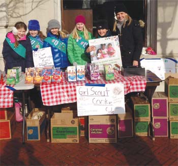 Members of Junior Girl Scout Troop 65321 were selling Girl Scout cookies recently in front of Starbucks at the corner of Beacon and Charles Streets. Shown from left are Grace Sanborn, Gwendolyn Tuckett, Holly Sullivan, Ciara King, Georgia Brucato and Troop Leader Cindy Sullivan.